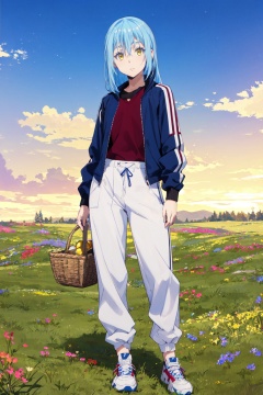 1other,looking at viewer,solo,androgynous,blue hair,long hair,hair between eyes,bangs,yellow eyes,standing,bomber jacket, crew neck sweater, joggers, high-top sneakers,<lora:Rimuru:0.8>,Rimuru_CYQL,bust,beautiful face,beautiful eyes,glossy skin,shiny skin,Meadow, Picnic basket, Afternoon sun, Flowers, Relaxation,beautiful detailed sky,beautiful detailed glow,posing in front of a colorful and dynamic background,masterpiece,best quality,beautiful and aesthetic,contrapposto,female focus,wallpaper,fashion,
