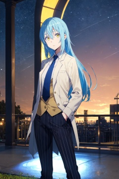 1other,looking at viewer,solo,androgynous,blue hair,long hair,hair between eyes,bangs,yellow eyes,standing,navy pinstripe suit, pale yellow dress shirt, solid navy tie, black cap-toe shoes,<lora:Rimuru:0.8>,Rimuru_CYQL,bust,beautiful face,beautiful eyes,glossy skin,shiny skin,Outdoor concert in city park, Music, Performance, Entertainment, Picnics,beautiful detailed sky,beautiful detailed glow,posing in front of a colorful and dynamic background,masterpiece,best quality,beautiful and aesthetic,contrapposto,female focus,wallpaper,fashion,