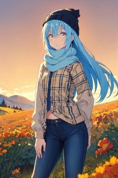 1other,looking at viewer,solo,androgynous,blue hair,long hair,hair between eyes,bangs,yellow eyes,standing,flannel shirt, jeans, beanie, boots, scarf,<lora:Rimuru:0.8>,Rimuru_CYQL,cowboy_shot,beautiful face,beautiful eyes,glossy skin,shiny skin,California poppies, Rolling hills, Orange hues, Golden hour, California landscape, Dusk sky,beautiful detailed sky,beautiful detailed glow,posing in front of a colorful and dynamic background,masterpiece,best quality,beautiful and aesthetic,contrapposto,female focus,wallpaper,fashion,