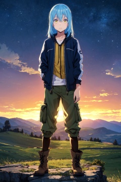 1other,looking at viewer,solo,androgynous,blue hair,long hair,hair between eyes,bangs,yellow eyes,standing,sherpa jacket, flannel shirt, cargo pants, work boots,<lora:Rimuru:0.8>,Rimuru_CYQL,panorama,beautiful face,beautiful eyes,glossy skin,shiny skin,Tuscany hills, Sunrise, Hike, Nature, Serenity,beautiful detailed sky,beautiful detailed glow,posing in front of a colorful and dynamic background,masterpiece,best quality,beautiful and aesthetic,contrapposto,female focus,wallpaper,fashion,