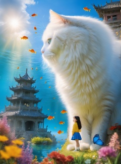 <lora:white cat 过拟V1.0-0008:0.9>,large white cat,a young girl,Sunlight is shining into the sea. There is a gorgeous dragon palace at the bottom of the sea,and the details are clear. Colorful fish are swimming around,, (masterpiece, best quality, highres:1.2),