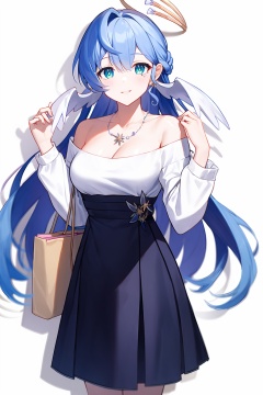 masterpiece, best quality,  <lora:robin:1>,1girl, solo, skirt, long hair, shirt, halo, blue hair, bag, black skirt, off-shoulder shirt, white background, off shoulder, jewelry, holding bag, holding, white shirt, necklace, breasts, long sleeves, looking at viewer, cleavage, blue eyes, bare shoulders, bangs, blush, simple background, shadow, handbag, standing, medium breasts, high-waist skirt, frilled shirt, collarbone, shirt tucked in, virtual youtuber, wings, feet out of frame, parted lips, hand up, hair ornament, smile, very long hair, frills, alternate costume, mostima (arknights), puffy long sleeves, head wings, closed mouth, aqua eyes