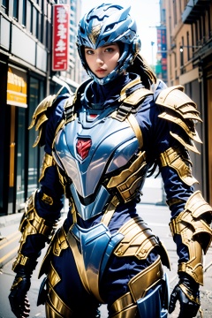 1girl,blue armor,outdoors,street,