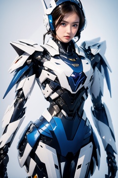 AgainCyberpunk, 1girl, solo, science fiction, helmet, breasts, looking at viewer, armor, lips, power armor, medium breasts, white background, android, short hair, robot joints, standing, simple background, cowboy shot, joints, brown hair, arms at sides, signature, realistic, blue eyes, brown eyes, robot