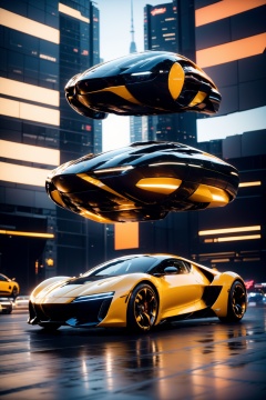 AgainCyberpunk, car, vehicle focus, motor vehicle, no humans, reflection, sports car, city, building, outdoors, sky, science fiction, realistic, scenery, headlight, spoiler \(automobile\), motion blur, night, skyscraper, road, glowing