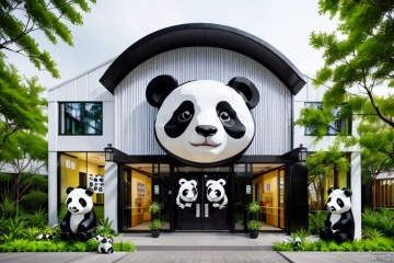 This image shows a modern style building entrance. There is a huge panda head on the top of the building, which is black and white in color and has black eyes. Under the panda head, there is the word "Panda", indicating that this may be a panda-themed store or exhibition space. The front of the building has several glass windows and doors, and a row of decorative panda statues at the door. The entire scene is surrounded by green plants, giving people a warm and harmonious feeling. The design of the building is simple and modern, using extensive timber elements to blend in with the surrounding natural environment