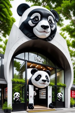 This image shows a modern style building entrance. There is a huge panda head on the top of the building, which is black and white in color and has black eyes. Under the panda head, there are the words "PANDA MODLAIR", indicating that this may be a panda-themed store or exhibition space. The front of the building has several glass windows and doors, and a row of decorative panda statues at the door. The entire scene is surrounded by green plants, giving people a warm and harmonious feeling. The design of the building is simple and modern, using extensive timber elements to blend in with the surrounding natural environment.