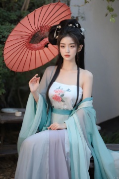 1girl,Oil-paper umbrella,hanfu,hair flower,holding umbrella,(big breasts:1.29), Nakagawa_Kokoro