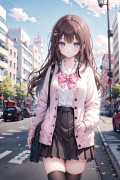 , sign, skirt, thighhighs, ground vehicle, letterboxed, day, bow, outdoors, shirt, building, holding, camera, pleated skirt, open clothes, car, 1girl, school uniform, motor vehicle, sky, bowtie, white shirt, pink jacket, long sleeves, holding camera, standing, red bow, jacket, blue eyes, blue sky, plant, solo focus, open jacket, road sign, bangs, bag, black hair, zettai ryouiki, serafuku, white thighhighs, black skirt, cloud, city, long hair, open cardigan, road, red bowtie, scenery, miniskirt, english text, cowboy shot, traffic light, cardigan, pink cardigan, sailor collar, closed mouth, brown hair, street, bus, lamppost, buttons, storefront, looking away, sunlight, pink bow, looking to the side, parted lips, railing, hair ornament, smile, window, tree, solo