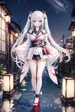 , 1girl, long hair, solo, japanese clothes, kimono, white hair, lantern, wide sleeves, night, breasts, looking at viewer, geta, tabi, socks, paper lantern, cleavage, water, night sky, sky, full body, sash, panties, platform footwear, smile, dutch angle, underwear, standing, twintails, hand fan, bangs, holding, off shoulder, long sleeves