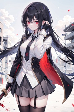 , 1girl, solo, skirt, weapon, sword, shirt, long hair, holding, white shirt, jacket, pleated skirt, red eyes, blood, holding weapon, open clothes, holding sword, rain, black hair, blurry, gloves, black jacket, blurry background, open jacket, bangs, necktie, collared shirt, closed mouth, katana, very long hair, black gloves, fingerless gloves, looking at viewer, dress shirt, depth of field, long sleeves, floating hair, blood on face, arms up, thighhighs, breasts, standing, blood on clothes, garter straps, grey skirt, v-shaped eyebrows, injury, medium breasts, outdoors, cuts, blue necktie, hair between eyes, sheath, cowboy shot, wet