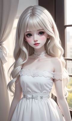 (Masterpiece:1.2), (best quality:1.2), (ultra high resolution:1.2), 1girl, solo, long hair, window, looking at viewer, white theme, white hair, curtains, pale skin, dress, white dress, black eyes, bare shoulders, upper body, lips, wavy hair, bow, choker, eyelashes, bangs, indoors , <lora:doll:0.5>