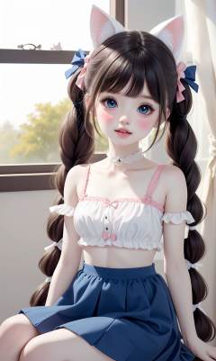 (Masterpiece:1.2), (best quality:1.2), (ultra high resolution:1.2), girl, animal ears, long hair, solo, sitting, braid, looking at viewer, twin braids, blue hair, bow, skirt, blue skirt, blue eyes, fake animal ears, window, cat ears, twintails, hair ornament, very long hair, parted lips, bangs, indoors, hair bow, white bra, white bow, curtains, frills, rabbit ears, bra, underwear, choker, blush, pale skin, white choker, teeth, lips, collarbone, knees up , <lora:doll:0.5>