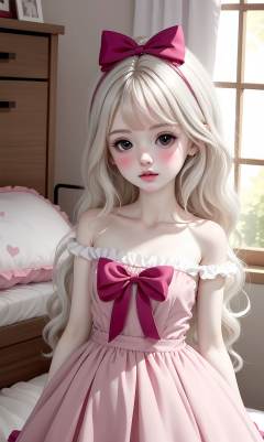 (Masterpiece:1.2), (best quality:1.2), (super high resolution:1.2), 1girl, long hair, solo, bow, dress, window, looking at viewer, pink bow, indoors, hair bow, pink dress, pale skin, bare shoulders, stuffed toy, wavy hair, blonde hair, strapless, stuffed animal, blush, lips, bed, bangs, black eyes, strapless dress, heart, pillow, white hair, collarbone, ribbon, <lora:doll:0.5>