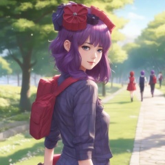 Masterpiece, ultra-detailed, highest quality, <lora:hokusai:1>1girl, katsushika hokusai,Purple hair,Walking on a park path in civilian clothes, close up, close-up of upper body,Anime, Illustration