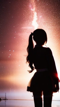 1girl, wedding dress, dress, white dress, brown hair, thighhighs, lace, lingerie, lace panties, see-through, veil, solo, panties,white panties, blurry, bridal veil, lace trim, white thighhighs, short hair, back, garter belt,thighs, twin tails, heterochromia, hair over one eye,frills,bangs,long sleeves,see-through,looking at viewer,long hair,ribbon,wavy hair, night,(silhouette:1.5),starry sky,stars,cave,school uniforms, no light,blurry background, depth of field