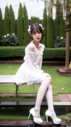 1girl, solo, pantyshot,dress,sitting, pantyhose, long hair, platform footwear, brown hair, shoes, full body, lolita fashion,white footwear, outdoors, natural skin pantyhose, frills,bangs,see-through, long sleeves,deep in the garden,night,looking_at_viewer,short hair, collarbone,breasts,sharply limbs,sitting on bench,platform-heel shoes, ribbon,from side