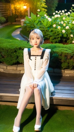 1girl, solo, pantyshot,dress,sitting, pantyhose, long hair,platform, platform footwear, brown hair, shoes, full body, lolita fashion,white footwear, outdoors, frills,bangs,long sleeves,see-through, natural skin pantyhose, deep in the garden,night,looking_at_viewer,short hair, collarbone,breasts,sharply limbs,sitting on bench,, ribbon,