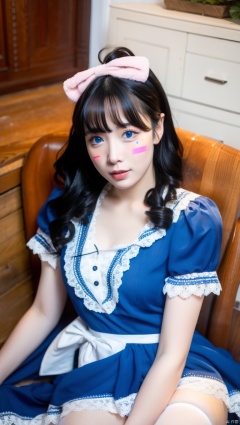 1girl, long wavy hair, blue eyes, thighhighs, looking at viewer, white thighhighs, sitting, bow, , dress, cherry, hair bow, blush, food, lips, apron, indoors, bangs, short sleevesblue dress, parted lips, facial mark, short hair, lace, smile, frills,holding, flower,skirt, , puffy short sleeves, ribbon, lace trim