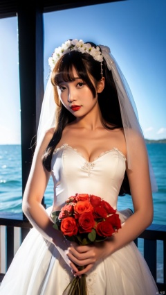1 girl,solo,ocean,outdoors,bouquet, flower, dress, jewelry, earrings, long hair, brown hair,hanfu dress, wedding dress,lolanse, red flower, veil, rose, bare shoulders, holding bouquet, white rose, sleeveless dress,standing, hair bow, bridal veil, bride, sleeveless, bow, ribbon, black hair, red lips, hair ribbon, lips, breasts,BREAK,collarbone,breasts,deep cleavage, strapless,