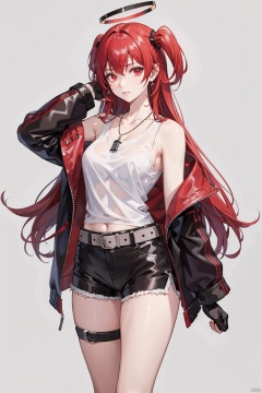 , 1girl, alternate hairstyle, solo, exusiai \(arknights\), long hair, halo, jacket, pantyhose, alternate hair length, hair over one eye, shorts, white jacket, black pantyhose, looking at viewer, open jacket, open clothes, shirt, black shirt, off shoulder, gloves, simple background, dog tags, fingerless gloves, black shorts, grey background, black gloves, wings, red eyes, energy wings, very long hair, red hair, bare shoulders, hand in pocket, index finger raised, sleeveless shirt, collarbone, sleeveless, short shorts, cowboy shot, arm up, long sleeves, purple hair, jewelry, alternate costume, breasts, bangs, closed mouth, **** top, belt, necklace, one side up, detached wings, legwear under shorts, standing
