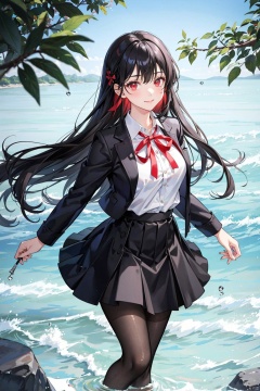 , 1girl, solo, skirt, pantyhose, long hair, black hair, outdoors, smile, ribbon, red ribbon, looking at viewer, red eyes, pleated skirt, neck ribbon, shirt, black pantyhose, school uniform, black skirt, bangs, long sleeves, black jacket, jacket, blush, white shirt, standing, leaf, closed mouth, water, tree, black nails, collared shirt, breasts, wading, sky, day, water drop, feet out of frame, nail polish, clothes lift, skirt hold, medium breasts, lifted by self