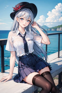 1 girl, souryou asuka langley, solo, thighhighs blue eyes, long hair, dress, silver hair, tie, shirt, sitting, looking at the audience, white shirt, chest, black thighhigh black dress, short sleeves, bangs, red tie, hair between eyes, sky, ultra short skirt, collar shirt, Zetai Liangmu daytime, smile, parted lips, blue sky, thighs, pleated skirt, medium chest, outdoor, headwear, side up, mechanical arm