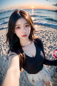 1girl,a woman takes a fisheye selfie on a beach at sunset, the wind blowing through her messy hair. The sea stretches out behind her, creating a stunning aesthetic and atmosphere with a rating of 1.2.,