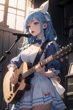 alice in wonderland costume、rock band、vocal、big breasts、blue SG guitar、play、Mike stand、sing、live house、real face、Whole body 100%