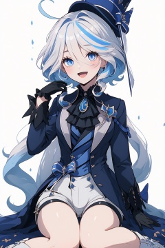 furina, 1girl, solo, gloves, single glove, white background, shorts, blue eyes, smile, long hair, hat, simple background, blue headwear, looking at viewer, sitting, open mouth, multicolored hair, ahoge, white shorts, black gloves, shirt, frilled sleeves, streaked hair, blue hair, long sleeves, hair between eyes, :d, ascot, jacket, top hat, brooch, very long hair, frills, white hair, hand up, bow, bangs, wariza, white shirt, short shorts