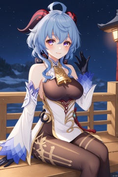 gan yu, 1girl, solo, ganyu \(genshin impact\), breasts, horns, long hair, bell, ahoge, detached sleeves, looking at viewer, blue hair, sitting, purple eyes, gloves, vision \(genshin impact\), bangs, bare shoulders, smile, black gloves, medium breasts, neck bell, sidelocks, white sleeves, gold trim, night, blush, pantyhose, outdoors, black pantyhose