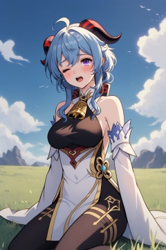 gan yu, 1girl, ganyu \(genshin impact\), solo, ahoge, breasts, horns, one eye closed, long hair, blue hair, bell, sitting, rubbing eyes, purple eyes, detached sleeves, gloves, black gloves, outdoors, sky, looking at viewer, bangs, bare shoulders, open mouth, blush, gold trim, neck bell, grass, white sleeves, blue sky, day, cloud, pantyhose, covered navel, tears, medium breasts, sidelocks, goat horns, large breasts, waking up, wariza, wiping tears, bodystocking, thighlet, long sleeves