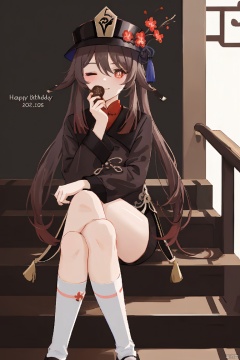 hu tao, masterpiece,best quality,1girl, solo, long hair, looking at viewer, smile, brown hair, red eyes, long sleeves, hat, hair between eyes, twintails, sitting, flower, one eye closed, shorts, socks, english text, symbol-shaped pupils, short shorts, chinese clothes, black shorts, crossed legs, white socks, black nails, happy birthday, chocolate, stairs, valentine, hu tao \(genshin impact\)