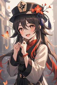 hu tao, 1girl, hu tao \(genshin impact\), hat, smile, flower, boo tao \(genshin impact\), jewelry, twintails, blush, bug, red eyes, butterfly, looking at viewer, long sleeves, open mouth, solo, hat flower, long hair, symbol-shaped pupils, bracelet, bead bracelet, black headwear, beads, brown hair, ghost, hair between eyes, bangs, :d, flower-shaped pupils, coat, multicolored hair, plum blossoms, very long hair, upper body, gradient hair, brown coat, hands up, blurry background, hair flaps, red flower, chinese clothes, shirt, red shirt, blurry, wide sleeves, fang