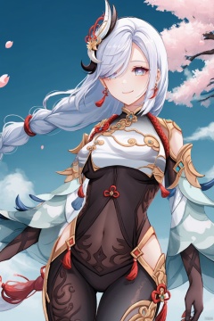 shenhe, 1girl, shenhe \(genshin impact\), solo, hair over one eye, hair ornament, long hair, breasts, looking at viewer, covered navel, breast curtain, blue eyes, bodysuit, hip vent, clothing cutout, gloves, cherry blossoms, smile, large breasts, shoulder cutout, flower, white hair, snowflakes, tassel, bangs, jewelry, braided ponytail, earrings, braid, holding, closed mouth, petals, black bodysuit, cowboy shot, black gloves, gold trim