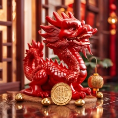 There is a red dragon on the mahogany table,with a sand gold base paired with gold blocks that fall together. The gold blocks are complemented by a red lantern with gold coins next to it,and the background is a retro double window with green plants.,<lora:---long-XL>,