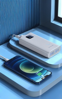 gaoji,The power bank sits on a table with a blue wall behind it and a grey curtain in the background. High resolution photography,sharp focus of detail,high quality photography style,<lora:GJsp4-XL-000005:0.9>,