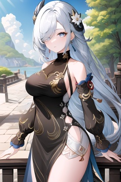(masterpiece, best quality:1.2),insanely detailed,absurdres,ultra-highres,ultra-detailed,best quality,slender,kawaii,perfect symmetrical face,ultra cute girl,ultra cute face,ultra detailed eyes,ultra cute,ultra beautifu,<lora:shenheh-000001:1>,shenhe\(frostflower dew\),shenhe \(genshin impact\),1girl,solo,long hair,hair over one eye,chinese clothes,backless dress,detached sleeves,grey hair,breasts,alternate costume,bare shoulders,china dress,nail polish,bare legs,headwear,outdoors,multicolored eyes,standing,