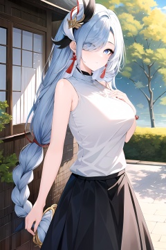 (masterpiece, best quality:1.2),insanely detailed,absurdres,ultra-highres,ultra-detailed,best quality,slender,kawaii,perfect symmetrical face,ultra cute girl,ultra cute face,ultra detailed eyes,ultra cute,ultra beautifu,<lora:shenheh-000001:1>,shenhe\(heytea\),shenhe \(genshin impact\),1girl,solo,hair over one eye,long hair,braid,sleeveless,earrings,black skirt,alternate costume,long skirt,breasts,grey hair,grey eyes,shirt,sleeveless shirt,white shirt,high heels,braided ponytail,tassel earrings,outdoors,standing,multicolored eyes,hairband,