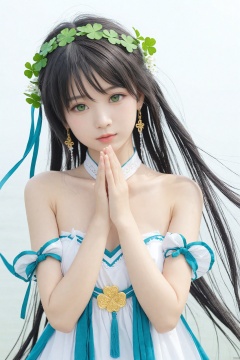 masterpiece,Realism,best quality,loli,1girl,Luo Tianyi (Vocaloid), clover, solo, long hair, green eyes, four-leaf clover, dress, flower, own hands together, looking at viewer, water, hair ornament, parted lips, very long hair, bangs, earrings, white background, jewelry, bare shoulders, upper body, white dress, hair flower, ribbon, simple background, hands up, blush