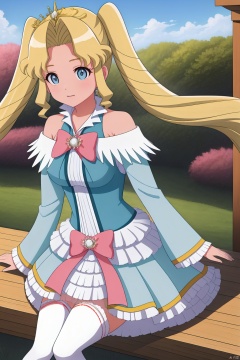 1girl, solo, long hair, looking at viewer, smile, open mouth, bangs, blue eyes, blonde hair, thighhighs, long sleeves, dress, bow, bare shoulders, twintails, sitting, very long hair, :d, outdoors, frills, detached sleeves, sky, day, cloud, white thighhighs, tree, blue sky, parted bangs, hair intakes, frilled dress, tiara, pink bow, brooch, bench