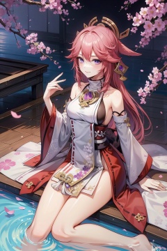yae miko, 1girl, solo, long hair, pink hair, animal ears, detached sleeves, breasts, looking at viewer, fox ears, purple eyes, bangs, smile, sitting, wide sleeves, cherry blossoms, hair between eyes, bare shoulders, lantern, jewelry, petals, hair ornament, earrings, water, yokozuwari, japanese clothes, feet out of frame, long sleeves, hand up, floral print, closed mouth, thighs, floppy ears, shirt, architecture, red skirt, very long hair, white shirt, flower, skirt, bare legs, medium breasts, outdoors, sidelocks, tassel, nontraditional miko, turtleneck, sleeveless, falling petals, fox shadow puppet, pink flower