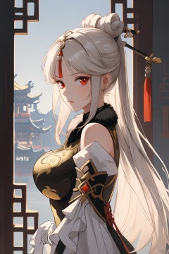 ningguang, masterpiece,best quality,1girl, solo, long hair, breasts, looking at viewer, bangs, large breasts, hair ornament, red eyes, gloves, dress, bare shoulders, white hair, sidelocks, detached sleeves, elbow gloves, from side, parted bangs, chinese clothes, china dress, fur collar, hairpin, ningguang \(genshin impact\)