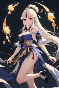 ningguang, 1girl, ningguang \(genshin impact\), long hair, solo, official alternate costume, dress, breasts, vision \(genshin impact\), tassel hair ornament, hair ornament, red eyes, looking at viewer, blue dress, jewelry, bangs, bare shoulders, smile, tassel, very long hair, high heels, parted bangs, bracelet, closed mouth, white hair, half updo, detached sleeves, medium breasts, bare legs, gem, multicolored clothes, thighs