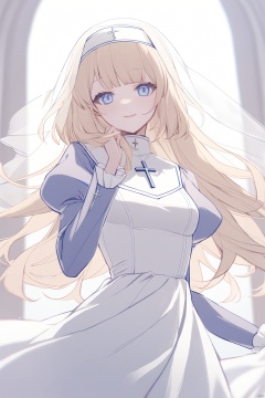 1girl, solo, long hair, looking at viewer, smile, bangs, blue eyes, blonde hair, long sleeves, dress, closed mouth, cowboy shot, puffy sleeves, hand up, white dress, cross, juliet sleeves, veil, nun, habit