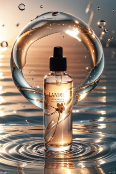 Product photography, no one, still life, bubble, glass bottle, bubble, watermarked flower, transparent frosted glass bottle, the product is placed on the bubble, the background is a round, transparent bubble, the background has many small bubbles, blue background,