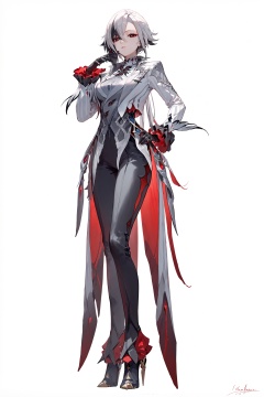 score_9, score_8_up, score_7_up, score_6_up, 8k, best quality, masterpiece, (ultra-detailed:1.1), (high detailed skin), (full body:1.4), white background, standing, looking at viewer, (solo:1.4), hand on hip, <lora:Arlecchino-pony-Tanger:0.8>, Arlecchino, def clothes, 1girl, x-shaped pupils, red pupils, black gloves, pants, symbol-shaped pupils, multicolored hair, black hair, white hair, (white background, simple background:1.3), (beautiful_face), ((intricate_detail)), clear face, ((finely_detailed)), fine_fabric_emphasis, ((glossy)), full_shot, <lora:Anime Boys Style SDXL_LoRA_20r_20e_8i_nr32_a16_Pony Diffusion V6 XL:0.5>, <lora:HKStyle:0.6>,