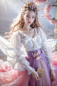 1girl, solo, long hair, looking at viewer, blue eyes, skirt, blonde hair, shirt, long sleeves, jewelry, sitting, closed mouth, white shirt, flower, earrings, puffy sleeves, lips, blue skirt, head tilt, grey eyes, wavy hair, blouse, pink flower, purple skirt, long skirt