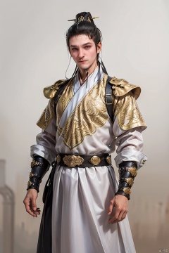 (High quality, High resolution, Fine details), 1boy,male focus,standing,black bodysuit, black armor,black hair, long legs,looking at viewer,hero's armour, simple background,sanguozhi, zskj, white robe, SGZ2,chinese clothes