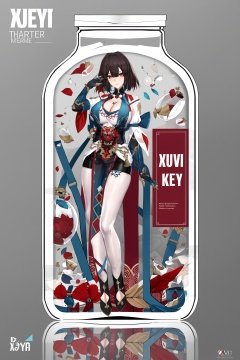 8k, best quality, masterpiece, (ultra-detailed:1.1), (high detailed skin), <lora:hanxuere-A3-Tanger:0.8>, xueyi, xueyi's def clothes, 1girl, black footwear, <lora:jijiav2-a3-Tanger-000005:0.8>, , jjijia, 2d, anime, 1girl, solo, long hair, breasts, looking at viewer, in container, bangs, cleavage, see-through, standing, hand up, character name, large breasts, grey background, reflection, medium breasts, copyright name, gradient, a glass bottle with a picture of a woman on it, a picture of a girl inside a clear container with a bunch of stuff in it,